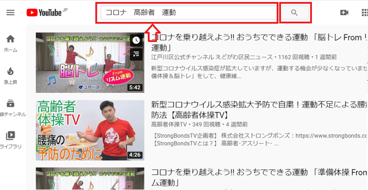 YOUTUBEで「コロナ 高齢者 運動」などのキーワードを入力して検索してみてください。たくさんの動画がアップされています。 この他にも「サザエさん体操」など色々あります。